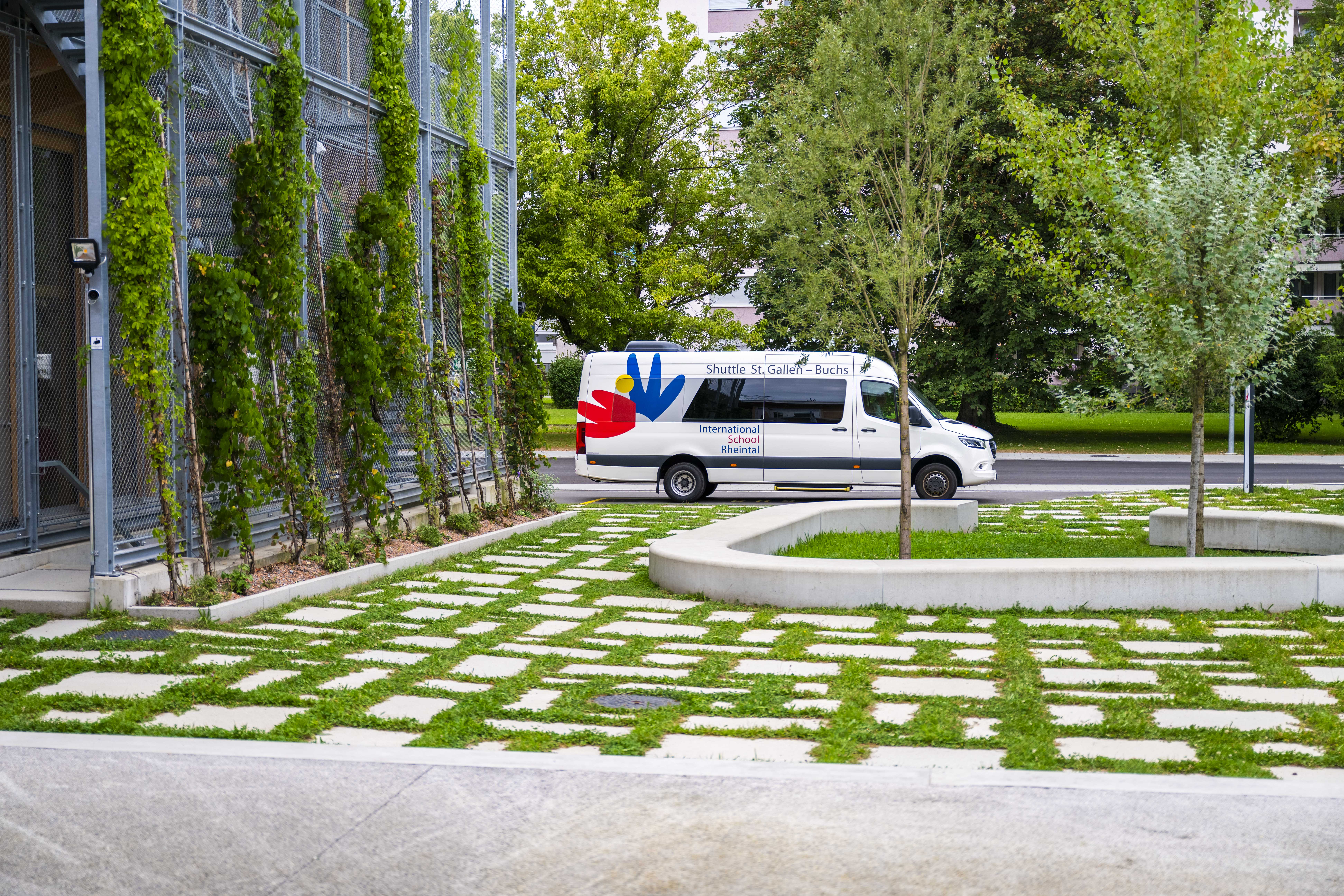 A modern Mercedes shuttle bus (2020) takes our students living in St. Gallen safely, reliably and comfortably and for free from St. Gallen Museumstrasse via Rheineck to our school in Buchs, thus moving the town of St. Gallen basically to our backyard.
